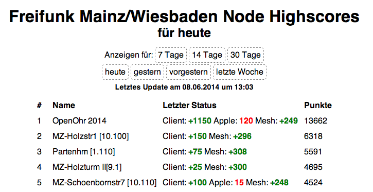 Auf unserem Server hat sich noch ein Plätzchen gefunden, und somit kann man nun unter nodegame.freifunk-wiesbaden.de nachschlagen, ob die eigene Node schon zu den Top 40 von Mainz/Wiesbaden/Partenheim gehört.